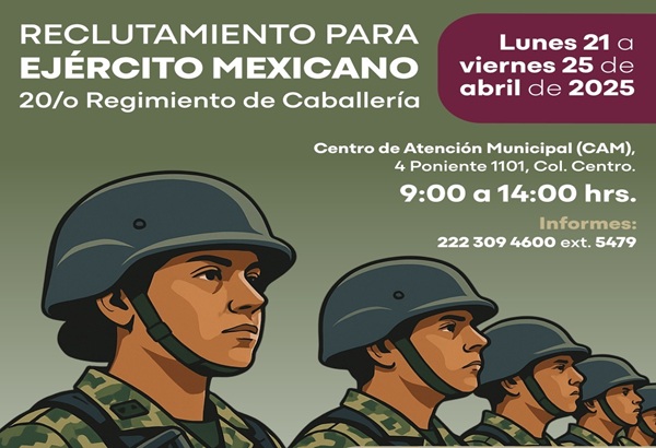 Para facilitar a los poblanos conseguir un empleo, el Ayuntamiento de Puebla mediante la Secretaría de Economía y Turismo en coordinación con la Secretaría de la Defensa Nacional (SEDENA) invitan al Reclutamiento para Ejército Mexicano, con 65 plazas disponibles de soldado de caballería, anunció su titular, Jaime Oropeza Casas.