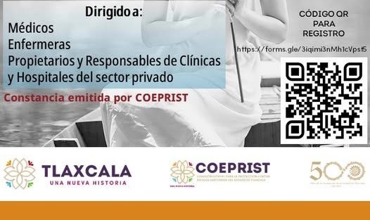 La Comisión Estatal para la Protección contra Riesgos Sanitarios (Coeprist) de Tlaxcala invita a profesionales de la salud del sector salud privado a participar en la jornada de capacitación para la “Prevención de la Muerte Materna”, que se llevará a cabo el próximo 31 de julio, con el objetivo de fortalecer las capacidades clínicas y administrativas que permitan salvar vidas durante el embarazo, parto y puerperio.