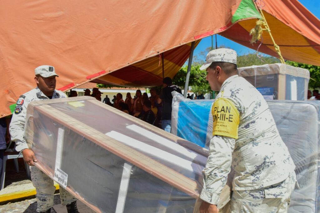 Lo anterior se realizó con el apoyo de 366 efectivos militares, entre jefes, oficiales y personal de tropa de las Regiones Militares VI y VII, quienes utilizaron 19 vehículos militares, 5 cajas secas y 10 camiones Torton para transportar los enseres, que incluyeron estufas, refrigeradores, ventiladores, licuadoras, utensilios de cocina y colchones, entre otros productos.