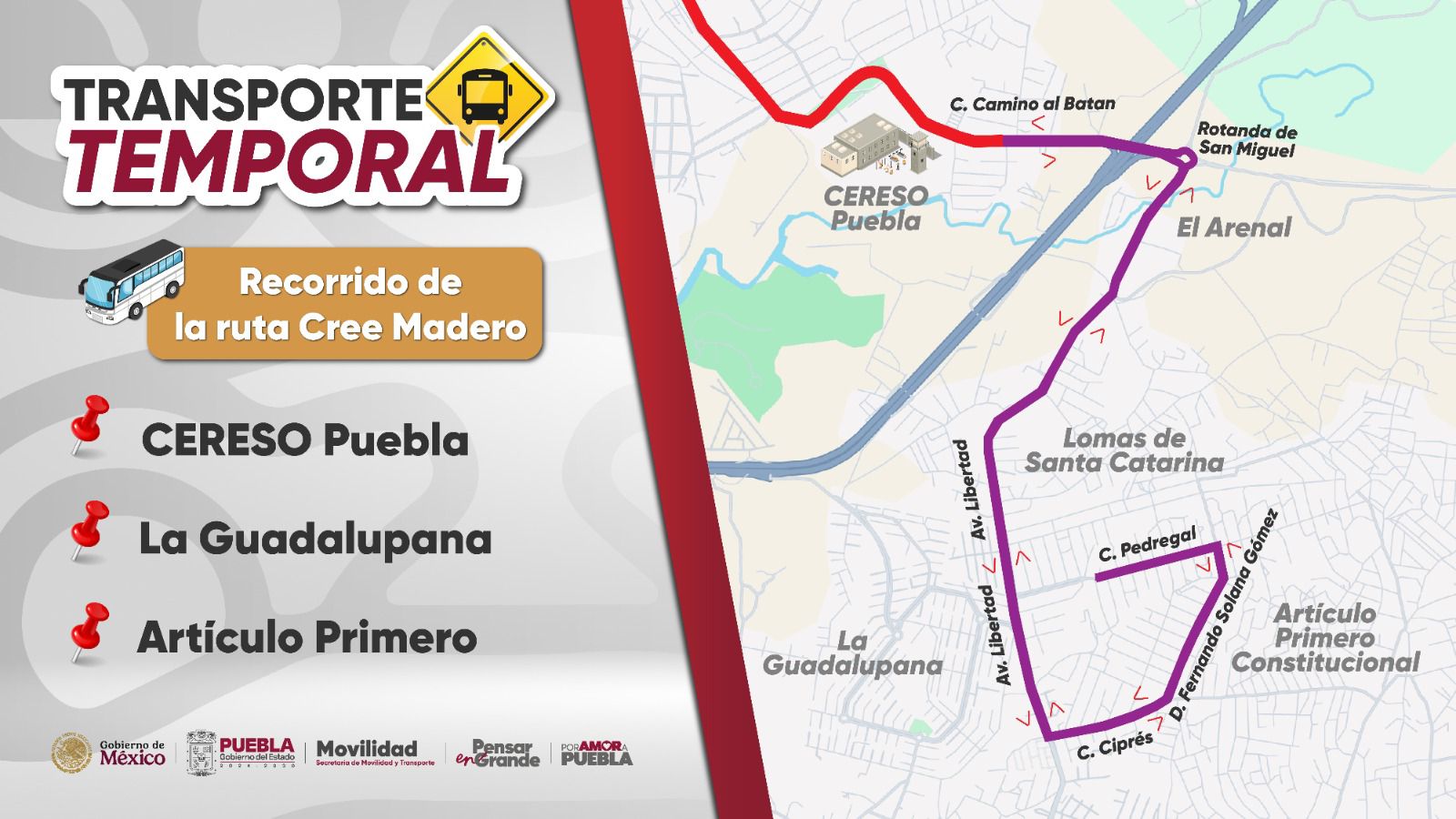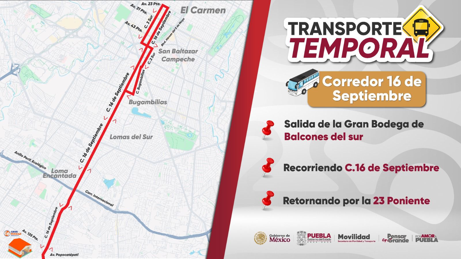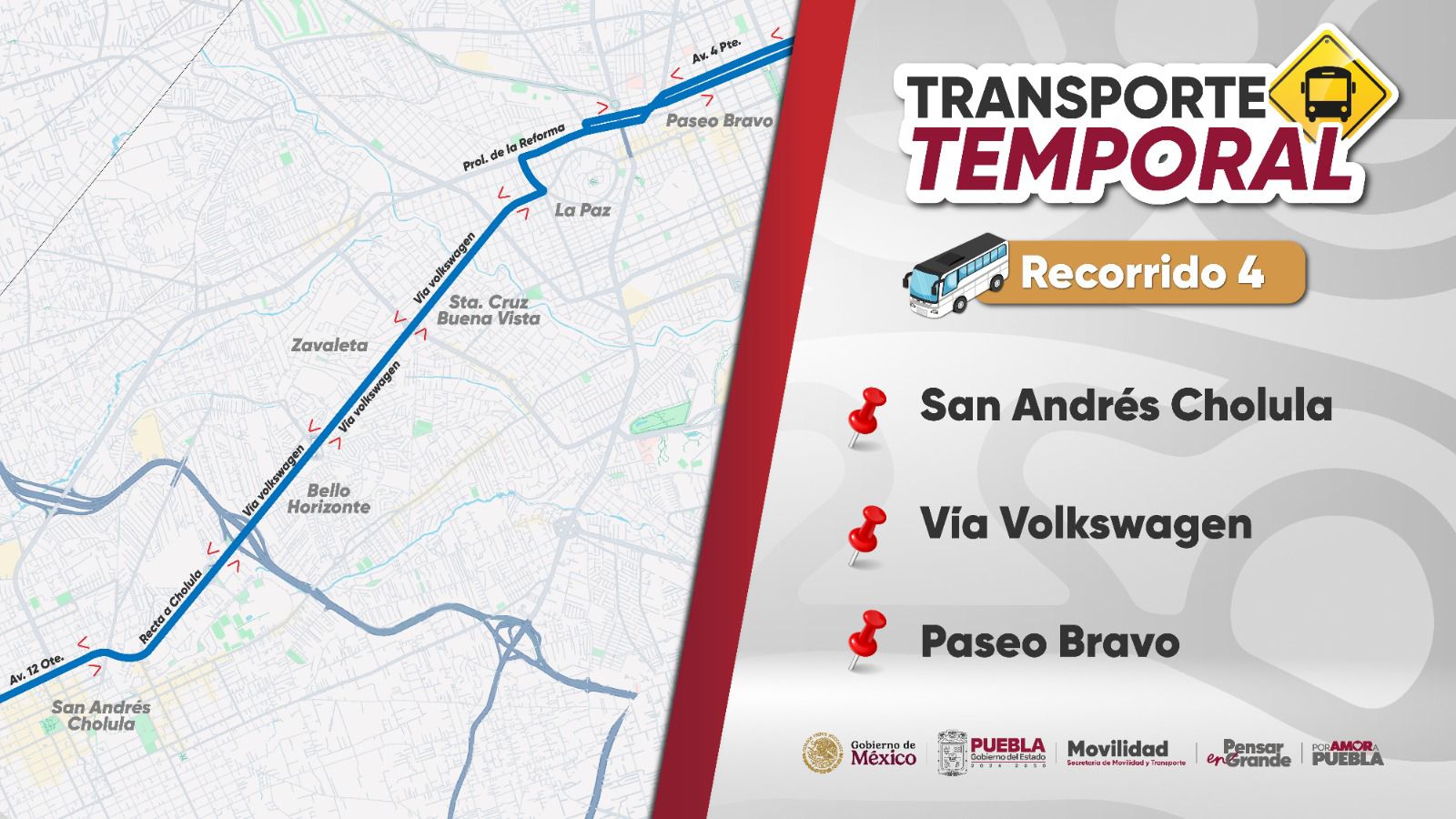 Respecto al Transporte Temporal los corredores o rutas se precisó que son: 16 de septiembre; Xonacatepec; Cree Madero; y Lateral de la Recta a Cholula.