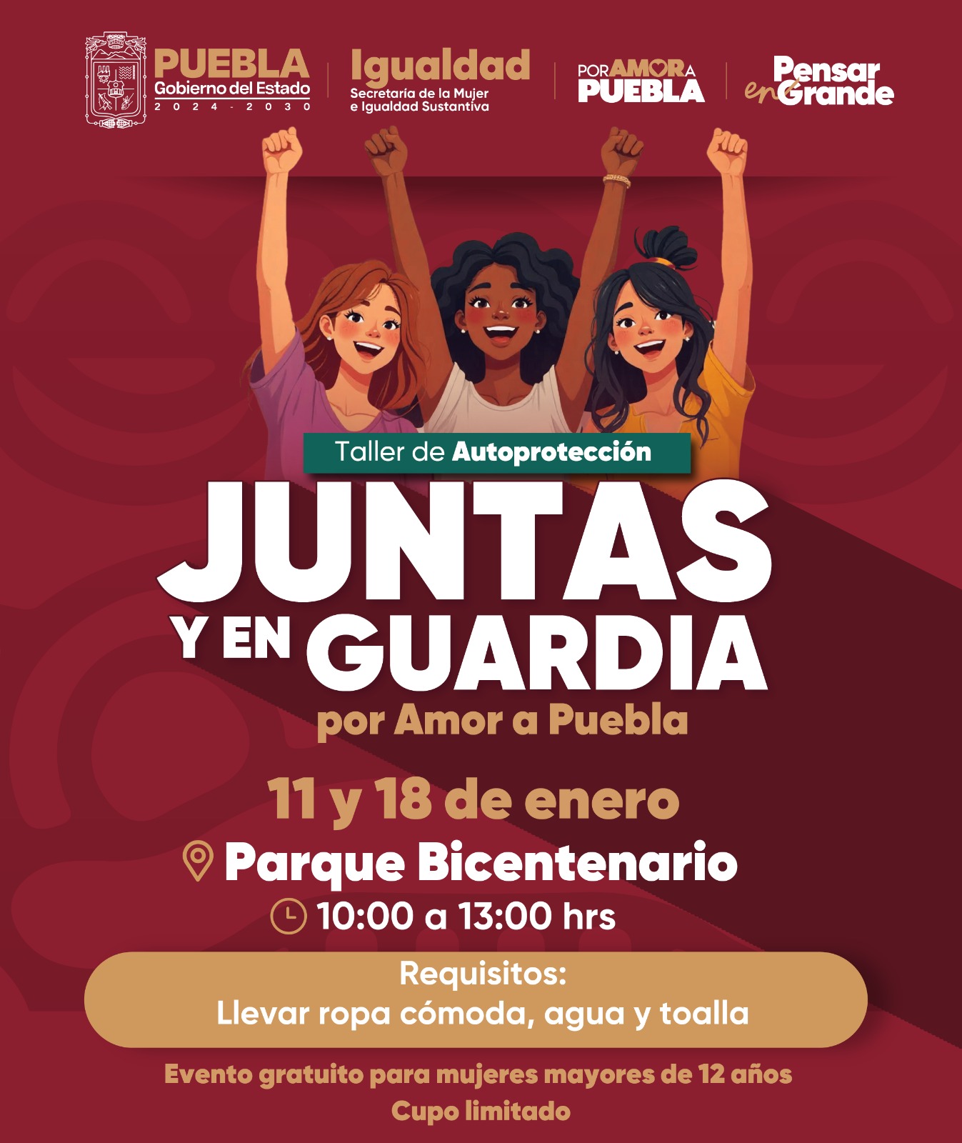 La Secretaría de la Mujer e Igualdad Sustantiva del Gobierno de Puebla, llevará a cabo el taller gratuito y dirigido a mayores de 12 años, denominado “Juntas y en Guardia, Por Amor a Puebla”, con el objetivo de promover técnicas de autoprotección para las mujeres poblanas en un espacio seguro.