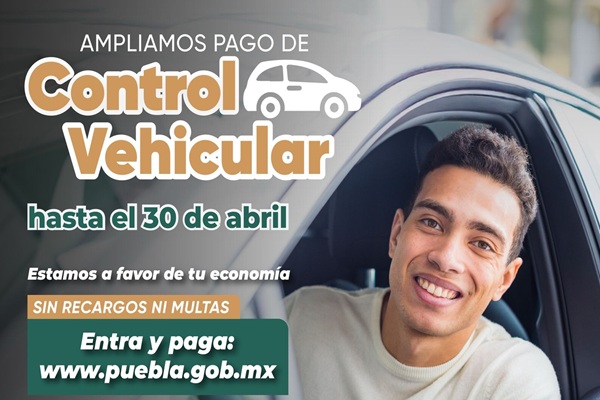 La Secretaría de Planeación, Finanzas y Administración del Gobierno del Estado hace un atento recordatorio a las y los propietarios de vehículos registrados en Puebla para que realicen el pago del control vehicular antes del 30 de abril del presente año. Durante este periodo no se aplicarán actualizaciones, recargos ni multas.