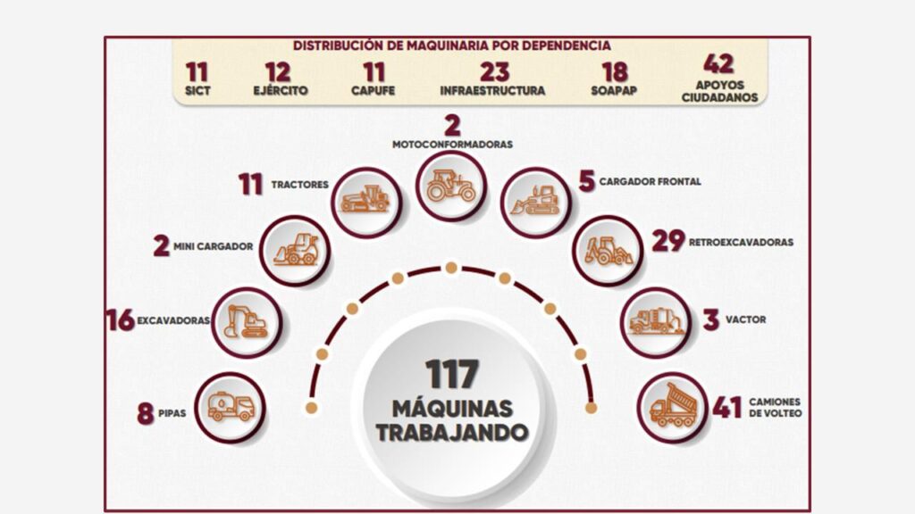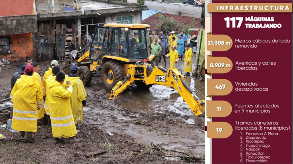 Por su parte, el secretario de Infraestructura, José Manuel Contreras de los Santos reiteró que los 117 unidades de los Módulos de Maquinaria corresponden a diversas dependencias, como la Secretaría de Infraestructura estatal, Caminos y Puentes Federales (CAPUFE), la Secretaría de Infraestructura, Comunicaciones y Transportes federal, el Ejército Mexicano y apoyos ciudadanos. Esto ha permitido remover más de 21 mil metros cúbicos de lodo; liberar casi 9 mil avenidas y calles; desazolvar casi 500 viviendas; además de liberar 19 tramos carreteros en 8 municipios como Francisco Z. Mena, Zihuateutla, Xicotepec, Huauchinango, Naupan, Pahuatlán, Tlacuilotepec y Eloxochitlán.