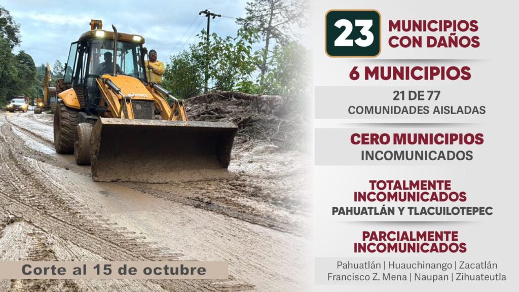 Finalmente, reconoció que en 6 municipios siguen aisladas 21 de 77 comunidades, por lo que se avanza en restablecer caminos alternos. Parcialmente se mantienen incomunicados los municipios de Pahuatlán, Huauchinango, Zacatlán, Francisco Z. Mena, Naupan y Zihuateutla.