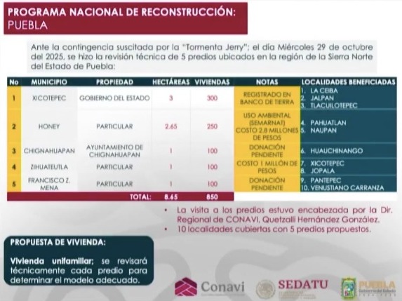 Es importante precisar que a estos predios se llevarían a vivir familias afectadas de al menos diez localidades donde es imposible volver a habitar por ser zona de riesgo, explicó el gobernador, Alejandro Armenta Mier, al citar que el Gobierno de Puebla y los Ayuntamientos serán los encargados de cubrir gastos referentes al terreno y la urbanización, mientras que Secretaría de Desarrollo Agrario, Territorial y Urbano (SEDATU) pagará la construcción de las nuevas casas.