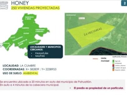 En el municipio de Honey, se ubicó un terreno particular de 2.65 hectáreas que costaría 2.8 millones de pesos, al cual habría que hacer cambio de uso de suelo pues actualmente es de «uso ambiental». En este lugar se edificarían 250 viviendas para damnificados de Pahuatlán y Naupan.