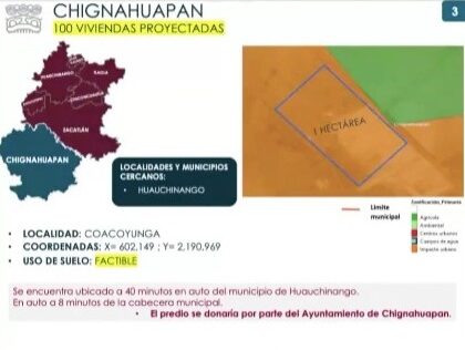 Respecto al terreno en Chignahuapan, se especificó que es propiedad del Ayuntamiento y consta de una hectárea, donde se podrían construir 100 casas para damnificados de la colonia Nuevo Monterrey de Huauchinango.