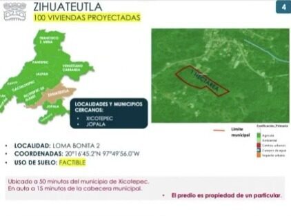 En el caso de Xicotepec se ha elegido un terreno de tres hectáreas propiedad del Gobierno del Estado de Puebla, que formaba parte del Banco de Tierra. En este lugar se proyecta construir 300 viviendas para familias damnificadas de: La Ceiba, Jalpan y Tlacuilotepec.