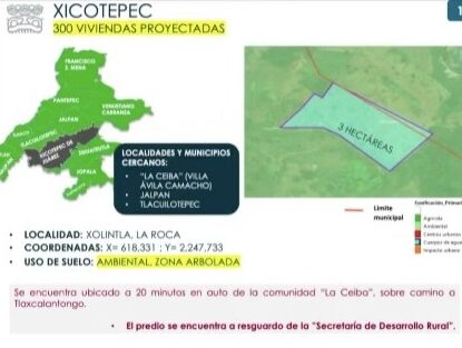 En el caso de Xicotepec se ha elegido un terreno de tres hectáreas propiedad del Gobierno del Estado de Puebla, que formaba parte del Banco de Tierra. En este lugar se proyecta construir 300 viviendas para familias damnificadas de: La Ceiba, Jalpan y Tlacuilotepec.