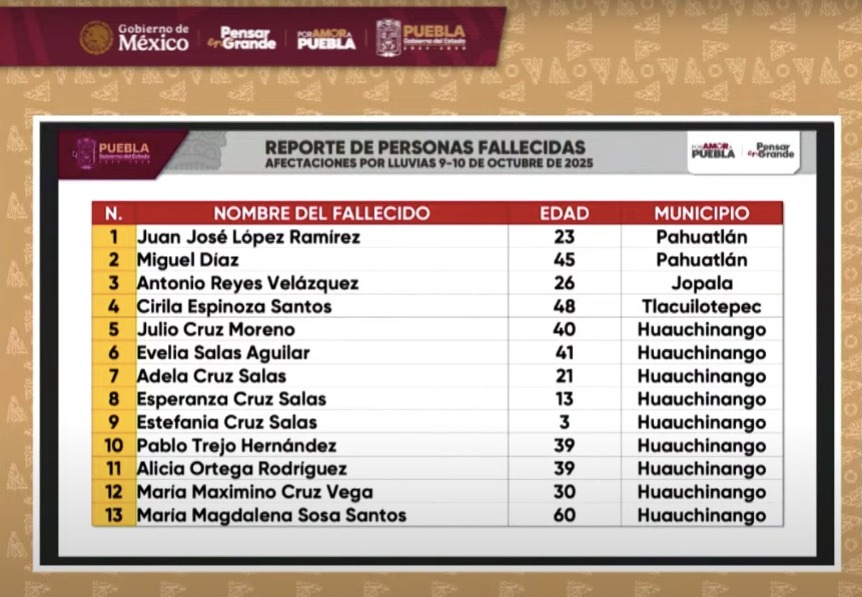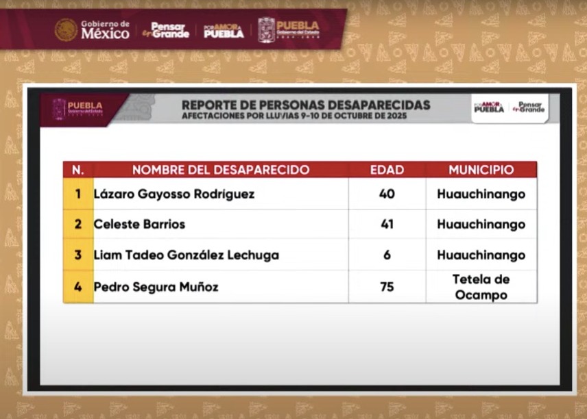 Un niño de seis años, un abuelito y dos adultos son las personas que siguen en calidad de desconocidos por deslaves y derrumbes causados por las lluvias registradas entre el 6 y el 11 de octubre, precisó este lunes 13 de agosto el gobernador de Puebla, Alejandro Armenta Mier al mostrar la lista completa de personas no localizadas y fallecidas.