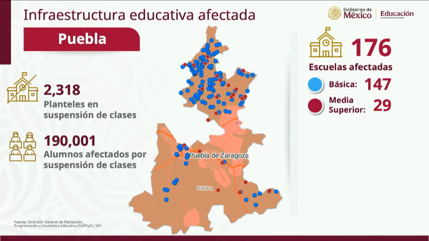 El titular de la Secretaría de Educación Pública (SEP) del Gobierno de México, Mario Delgado Carrillo informó que hay 2,318 escuelas sin clases en Puebla debido a las afectaciones en calles, caminos o carreteras, que impiden la llegada de 190 mil estudiantes en las Sierras Norte, Nororiental y Negra.