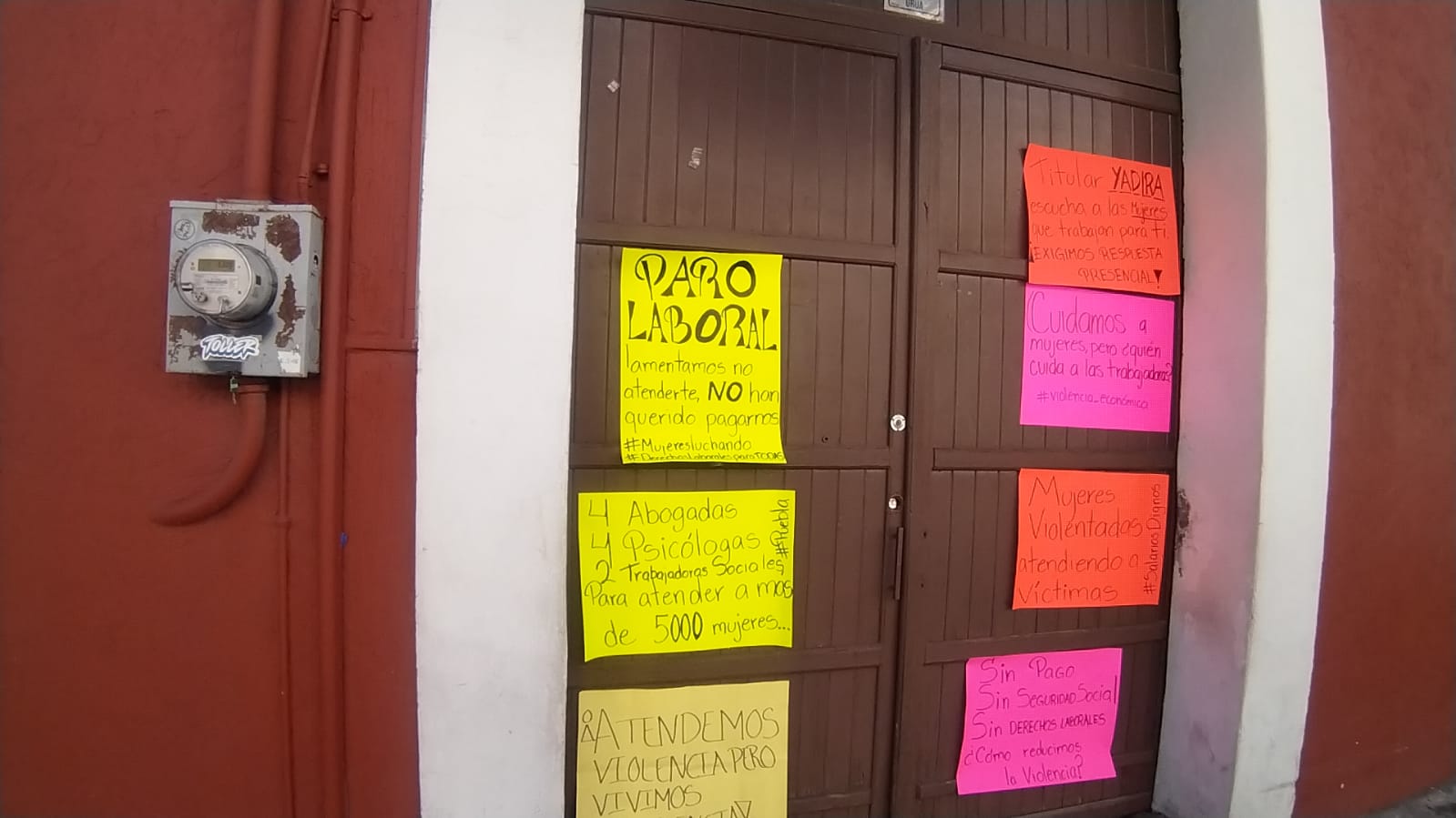 «Atendemos violencia, pero vivimos violencia» y «Sin pago, sin seguridad social y sin derechos laborales, ¿cómo reducimos la violencia?» son algunas de las consignas que fueron exhibidas este viernes en el inmueble localizado en la 2 sur 908.