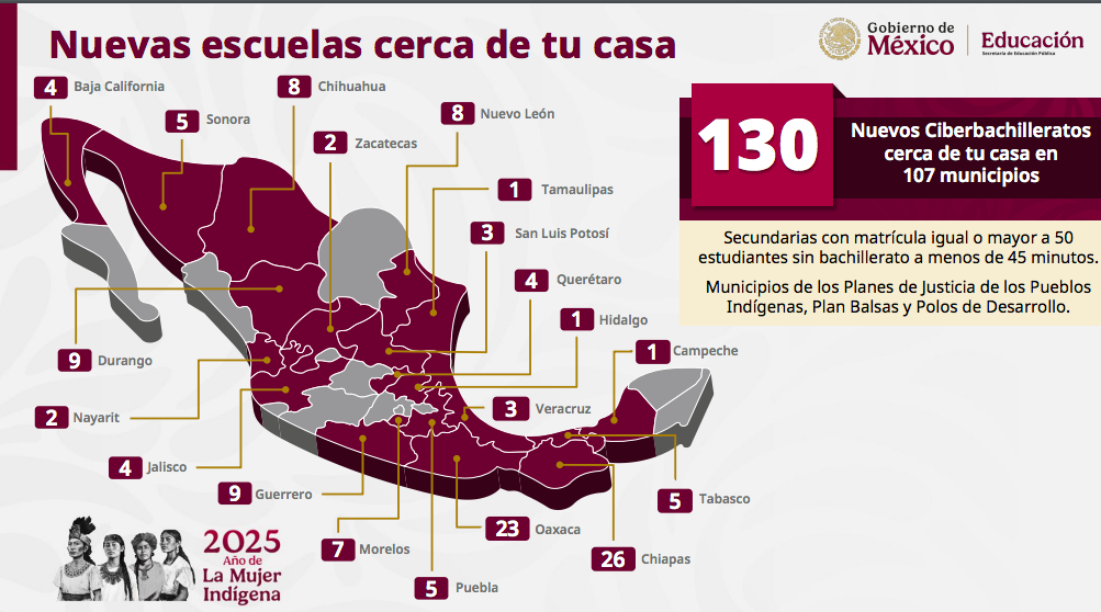 Sobre la reconversión de 35 secundarias que serán preparatorias en su turno vespertino, detalló que, seis ya fueron concluidas en Acolman, Chalco, Ixtapaluca, Naucalpan, Tecámac y Zumpango; 10 serán entregadas este mes en Cajeme, Chimalhuacán, Ecatepec, Gómez Palacio, dos en Mérida, Nicolás Romero, Saltillo, Soledad de Graciano Sánchez y Torreón; 11 en enero 2026, Atenco, dos en Juárez, dos en León, Morelia, Nuevo Laredo, San José del Cabo, Santa Cruz de Juventino Rosas, Tonalá y Uruapan; cuatro en febrero 2026, Apaseo el Grande, Ayotlán, Yautepec y Zacatecas; dos en marzo 2026 en Bahía de Banderas y Mazatlán; finalmente dos en abril 2026 en Berriozábal y Culiacán.