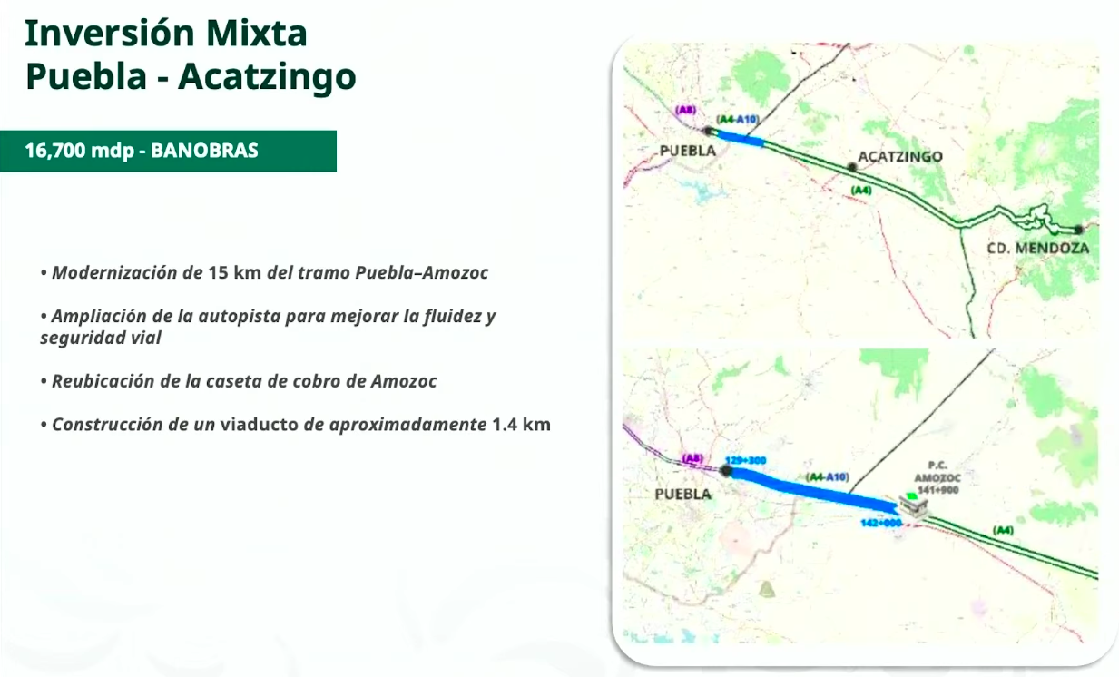 El titular de la Secretaría de Infraestructura, Comunicaciones y Transportes (SICT) anunció la ampliación de 15 kilómetros de la autopista Puebla-Acatzingo, la reubicación de la caseta y la construcción de un viaducto de 1.4 kilómetros en Amozoc.