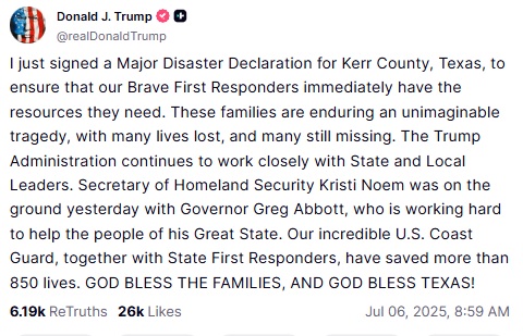 Estas familias están sobrellevando una tragedia inimaginable, se han perdido muchas vidas y muchos más siguen desaparecidos», escribió el mandatario en su cuenta de la plataforma Truth Social.