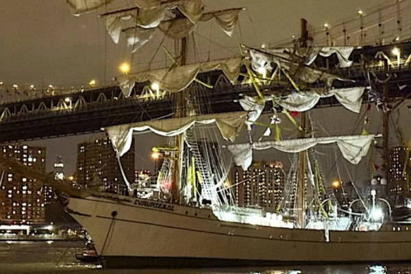 En distintos videos se puede ver a la embarcación navegando a baja velocidad, con su aparejo lleno de luces blancas mientras los cadetes se equilibraban en lo alto de las vergas del barco, los palos que sostienen las velas.