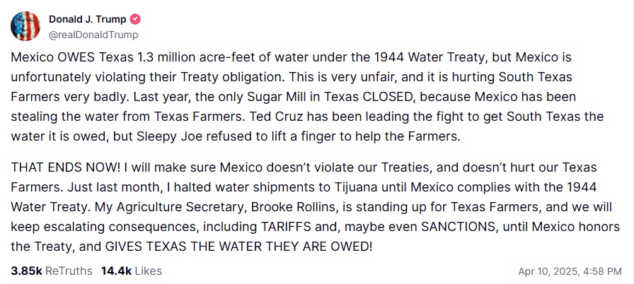 Mi Secretaria de Agricultura, Brooke Rollins, está defendiendo a los agricultores de Texas, y seguiremos escalando las consecuencias, incluyendo ARANCELES y, tal vez incluso SANCIONES, hasta que México honre el Tratado, ¡y Dé A TEXAS EL AGUA QUE SE LE DEBE!», añadió.