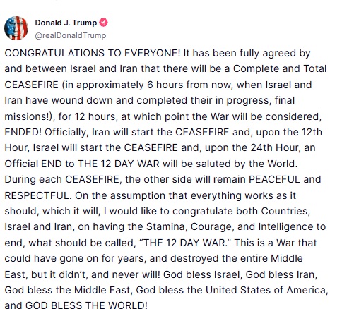 Tres horas antes, en la tarde del lunes en Washington, Trump había anunciado en su plataforma, Truth Social, un cese al fuego entre Israel e Irán: «¡ENHORABUENA A TODOS! Israel e Irán han acordado plenamente» que habrá un ALTO EL FUEGO total (en aproximadamente seis horas, cuando ambos países hayan completado sus misiones finales), durante doce horas, momento en el cual se considerará que la guerra habrá TERMINADO».