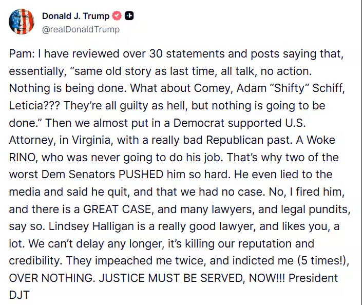 El segundo mensaje de este sábado empezaba con el tono con el que un padre o una madre lee la cartilla a un hijo que le ha decepcionado: “Pam: he revisado más de 30 declaraciones y publicaciones”, dice. A continuación, el presidente acusa a la fiscal general de no cumplir con sus objetivos de perseguir a los adversarios políticos de Trump. Es “la misma historia de la última vez: pura palabrería y nada de acción. No se está haciendo nada. ¿Y qué hay de Comey, Adam Shifty Schiff y Leticia? Son todos culpables, pero no pasa nada”.