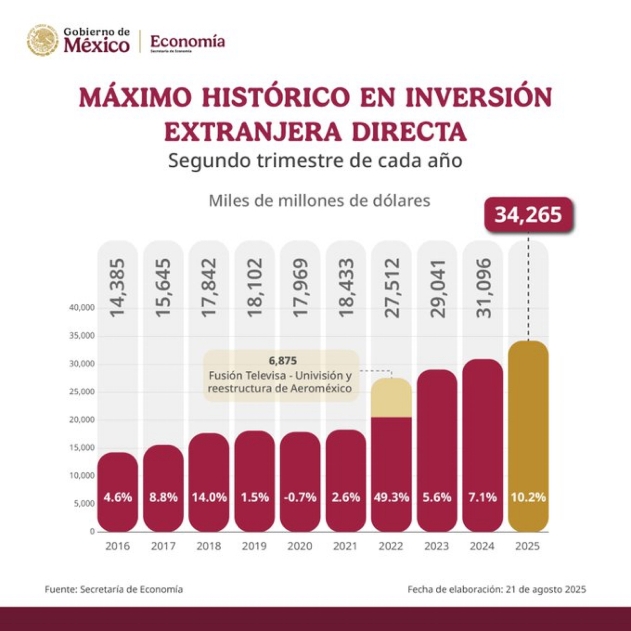 En la apertura de su conferencia mañanera, la presidenta de la República Mexicana, Claudia Sheinbaum Pardo, celebró el registro de inversiones extranjeras, la cual apuntó fue de 34 mil 265 millones de dólares en el segundo trimestre de 2025.