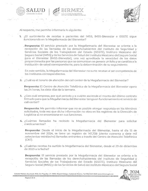 En una solicitud de información hecha a Birmex el 20 de noviembre de 2024, el organismo respondió: “La Megafarmacia del Bienestar no surte recetas al ser competencia de los institutos correspondientes”.