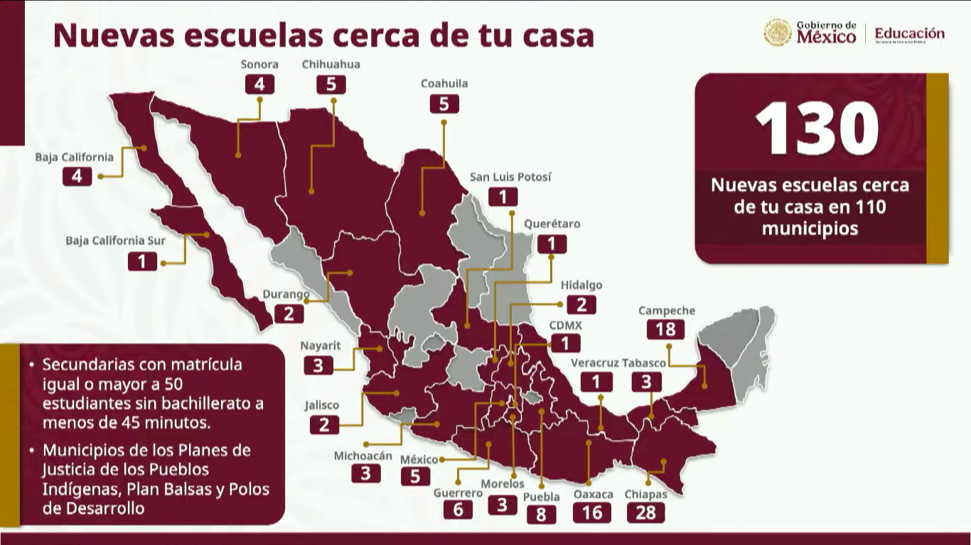 El Gobierno de México, a través de la Secretaría de Educación Pública (SEP), informó que, como parte del Plan de Ampliación de Cobertura de Educación Media Superior, en 2026 se crearán 130 nuevas preparatorias en 110 municipios, las cuales estarán cerca de las casas de las y los jóvenes, como parte de las 202 acciones de infraestructura para incrementar los espacios en bachillerato que incluye 20 nuevos Centros de Bachillerato Tecnológico Industrial y de Servicios (CBTIS), 52 ampliaciones de planteles con alta demanda, y con ello serán 65 mil 400 lugares más en este nivel educativo.