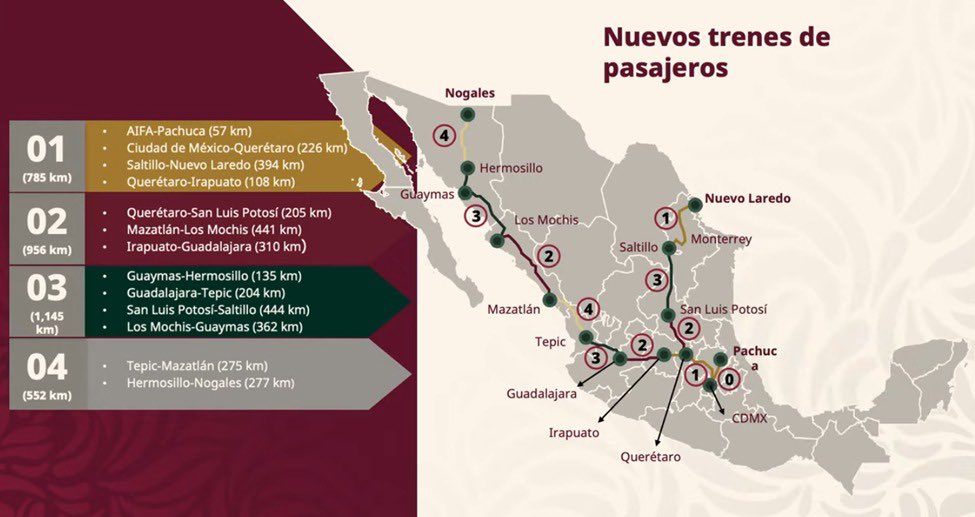 Además, destacó que, con la recuperación de los trenes de pasajeros, el objetivo es llegar de la Ciudad de México a Nuevo Laredo, Tamaulipas; así como de la Ciudad de México a Nogales, Sonora.