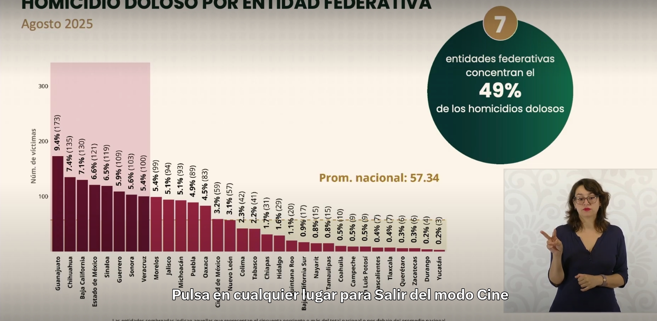 El Gabinete de Seguridad del Gobierno de México informó que con cifras consolidada al 31 de agosto, se reporta una disminución de 32 por ciento de homicidios dolosos respecto a septiembre de 2024, lo que implica que en agosto se registraron 27 homicidios menos, lo que convierte a agosto 2025 el agosto más bajo desde el 2015 en este delito.