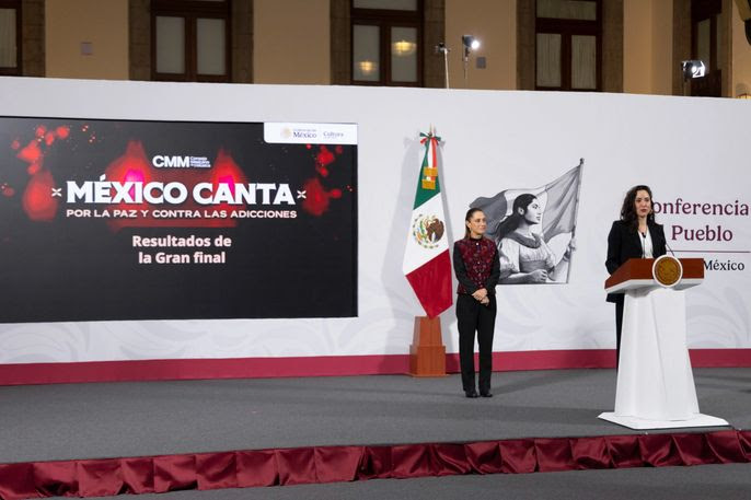 La Presidenta Claudia Sheinbaum Pardo anunció que, como parte de la iniciativa binacional México Canta por la paz y contra las adicciones, las y los ganadores y finalistas iniciarán una gira en la que realizarán conciertos, así como visitas a escuelas y centros de jóvenes para promover, a través de la nueva música mexicana, letras que no hagan apología a la violencia o al consumo de drogas.