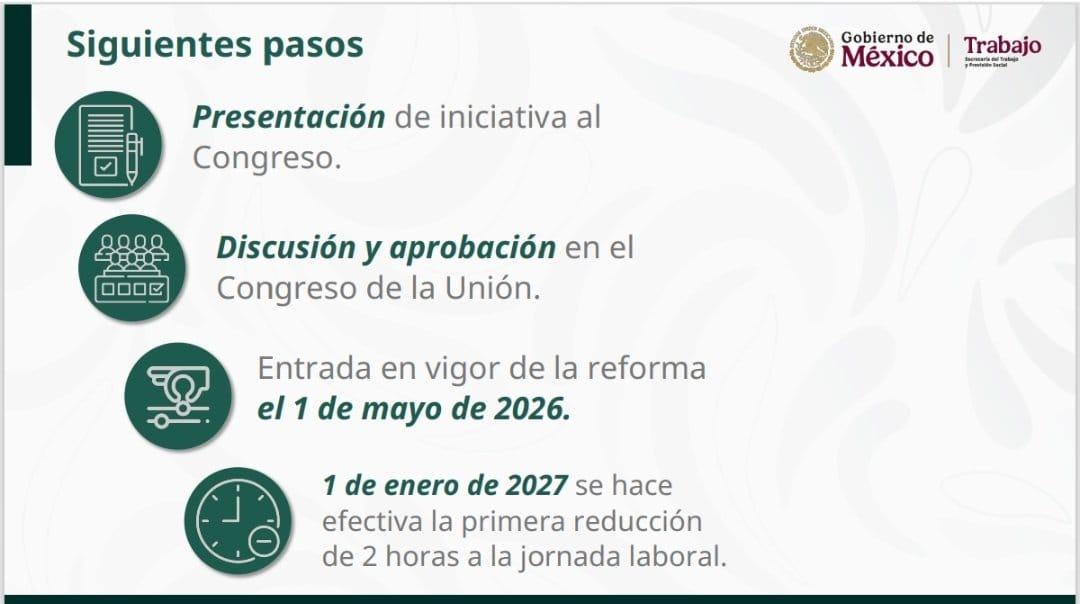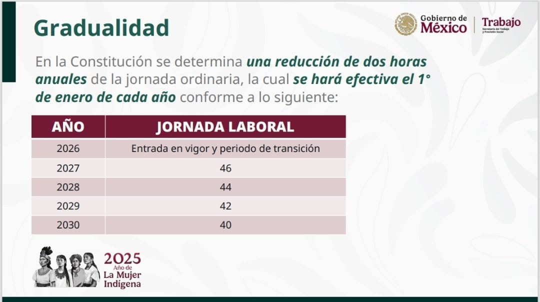 La presidenta Claudia Sheinbaum anuncio que la reducción de la jornada laboral de 48 a 40 horas se llevará a cabo de manera gradual, hasta lograrse en su totalidad en el año 2030. Además, adelantó que no se reducirán los salarios ni las prestaciones a los trabajadores.