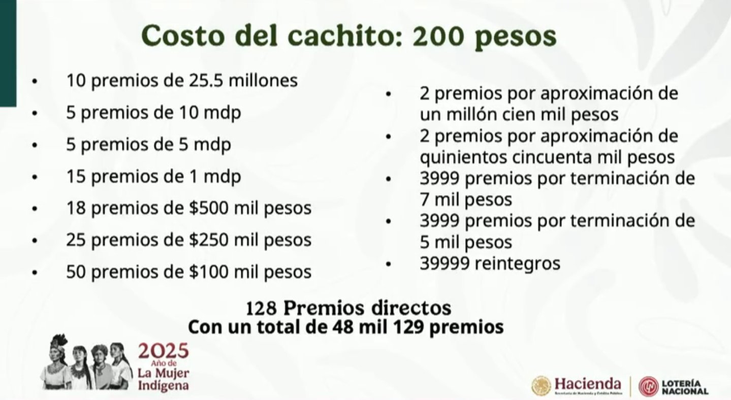 Explicó que el premio mayor consta de 255 mdp, en honor a los 255 años de la fundación de la Lotería Nacional, el cual estará dividido en 10 premios de 25.5 mdp, pero además se entregarán los siguientes premios: