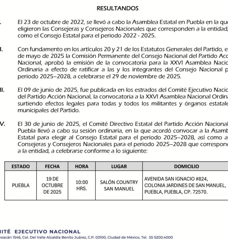 El documento refiere que, en sesión ordinaria del 30 de junio, el Comité Directivo Estatal (CDE) del PAN acordó convocar a la Asamblea Estatal para el 19 de octubre en el Salón Country San Manuel.