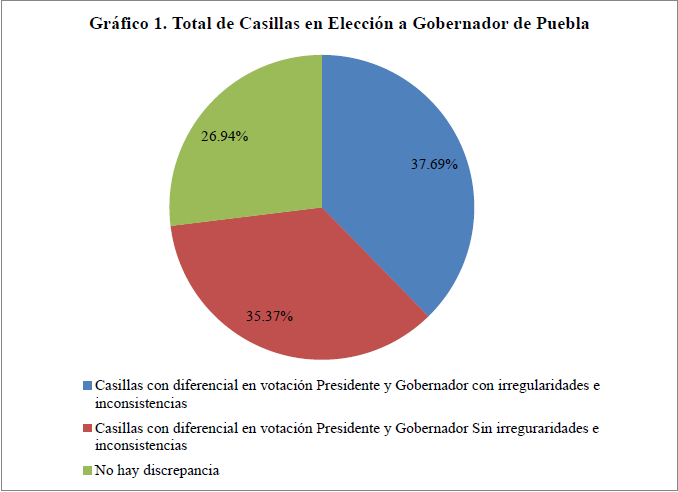 En cualquiera de los casos, la alta incidencia de irregularidades e inconsistencias, fortalece la evidencia del Estudio realizado, en función de que el principio de certeza de la Elección a Gobernador del Estado de Puebla se ha perdido y la manipulación de los resultados oficiales permite inferir que se violentó de manera flagrante la voluntad popular el 1 de julio en la elección de gobernador del estado de Puebla.