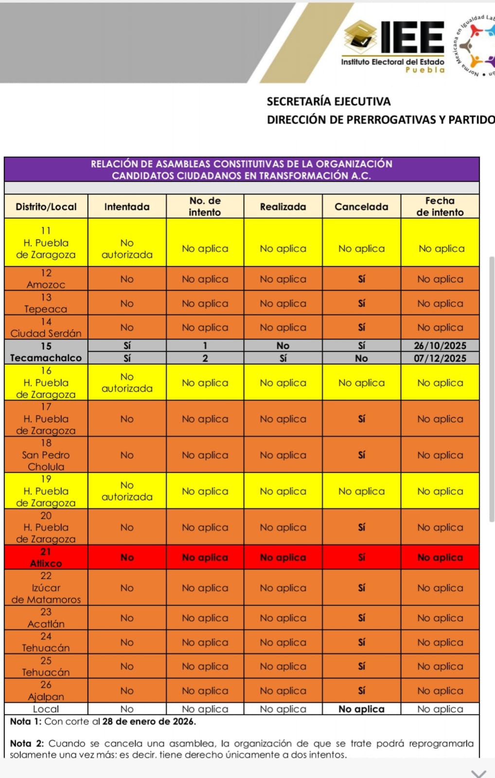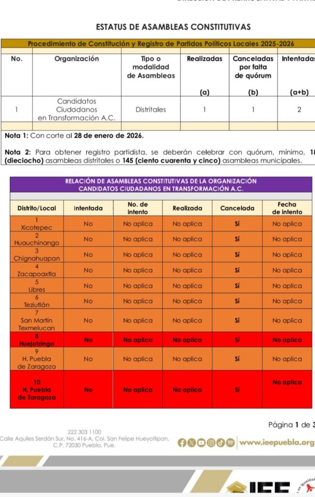 En la página de internet del Instituto Electoral del Estado (IEE), se puede observar que Fuerza Obradorista logró hacer solamente una asamblea, precisamente en Tecamachalco, donde habría conseguido juntar el mínimo de asistentes afiliados, un poco más de 400.