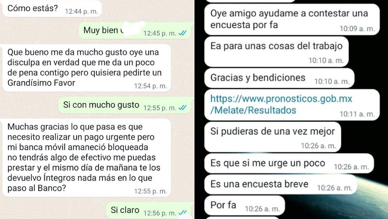 En los mensajes se aprecia cómo los hampones envían mensajes a la lista de contactos, saludando y posteriormente pidiendo un préstamo de 5 mil pesos a una cuenta de banco.