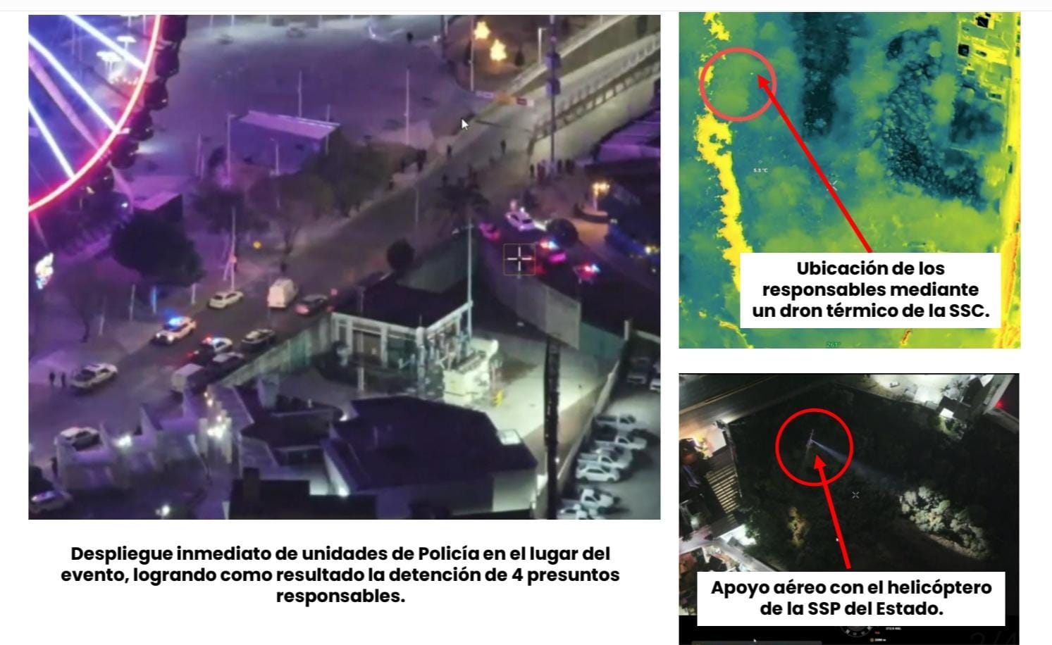 En posicionamiento interinstitucional, de la Secretaría de Seguridad Ciudadana (SSC), Secretaría de Seguridad Pública (SSP) del Estado, Ejército y Guardia Nacional, se informó que se logró la detención de cuatro probables responsables, además, fueron aseguradas, en distintos puntos, dos motocicletas, que podrían estar relacionadas con los hechos.