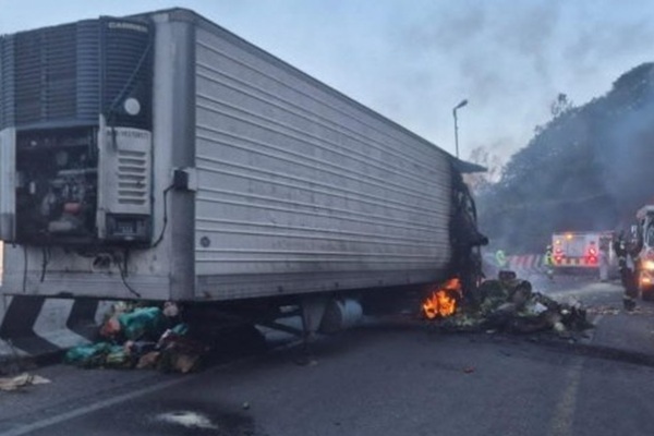 Participó un tráiler que jalaba una caja seca refrigerante cargada con frutas y verduras; otro tractocamión con una plana cargada con mallas metálicas para construcción, un tráiler que remolcaba una jaula granelera enlonada y un camión de carga tipo rabón que transportaba pacas de alimento seco, este último terminó reducido en cenizas.