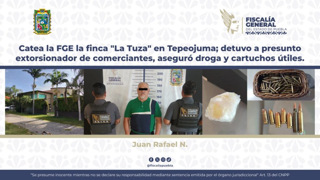 La Fiscalía General del Estado informa que como resultado de labores de inteligencia, análisis de la información y trabajo de campo, fue ejecutado un cateo en la finca «La Tuza», del municipio de Tepeojuma, lo que derivó en la detención en flagrancia de Juan Rafael N., presunto responsable de delitos relacionados con la extorsión a comerciantes, asimismo, se aseguró droga y cartuchos útiles.