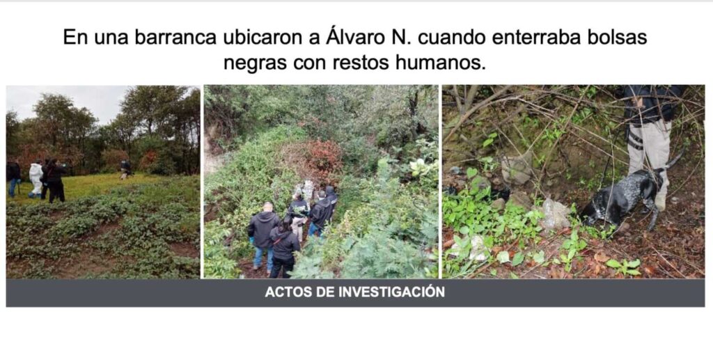Los policías municipales encontraron a Álvaro N. en cuclillas removiendo tierra con ambas manos en una parte de la barranca, tratando de ocultar una bolsa de plástico color negro que contenía restos humanos. Cabe decir que se halló también un fragmento óseo del cráneo de una persona.