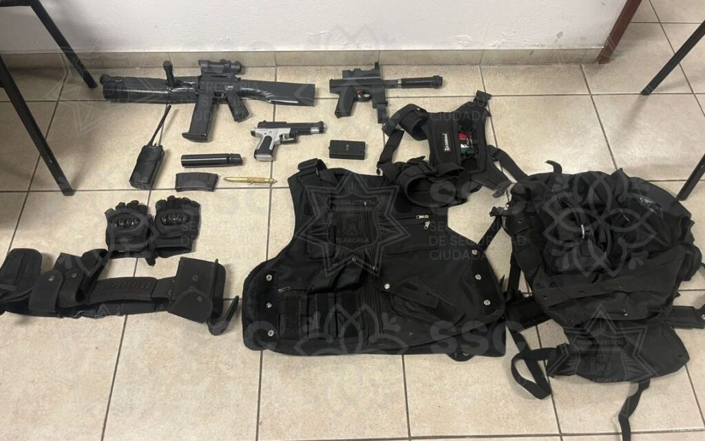 Ante esta situación, los oficiales de la SSC le realizaron una inspección preventiva conforme a los protocolos establecidos, localizando entre sus pertenencias: una réplica de arma de fuego corta, una réplica de arma larga, una réplica de arma tipo subametralladora, gas pimienta, un radio portátil, un dispositivo tipo táser color negro, una fornitura y un chaleco balístico.