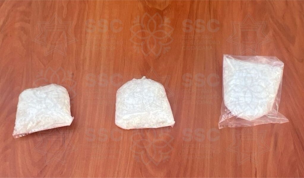 Ante la situación, los oficiales de la SSC procedieron a marcarle el alto al conductor para efectuar una revisión preventiva, conforme a los protocolos establecidos. Durante la inspección, se localizó una bolsa transparente que contenía tres envoltorios de diferentes tamaños con una sustancia granulada de color blanco, con las características propias de la droga conocida como cristal.