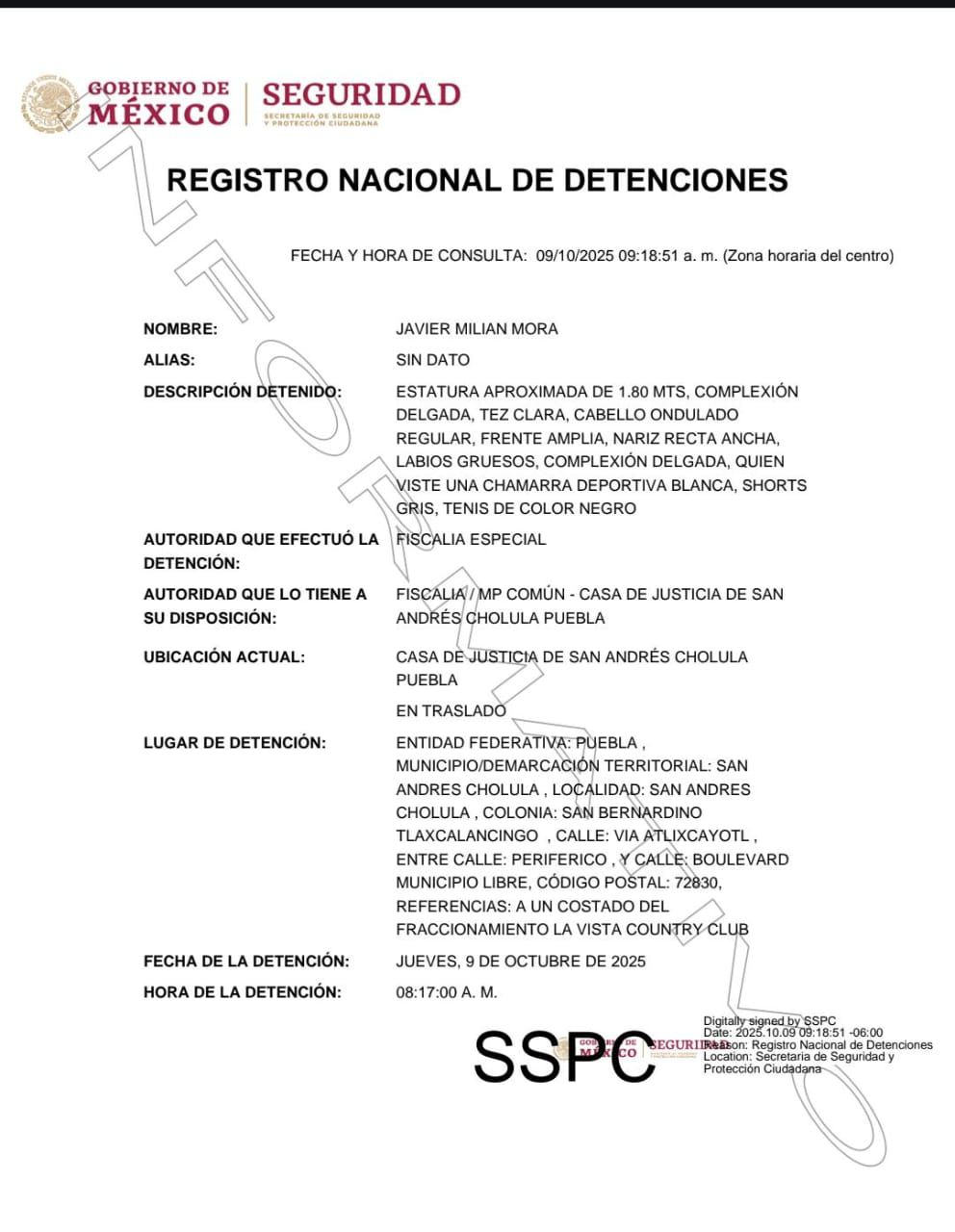 Su aprehensión se efectuó con un operativo desplegado sobre la Vía Atlixcáyotl, a un costado del exclusivo fraccionamiento de «La Vista Country Club», en el municipio de San Andrés Cholula, en punto de las 8:17 de la mañana, de acuerdo con el Registro Nacional de Detenciones (RND).