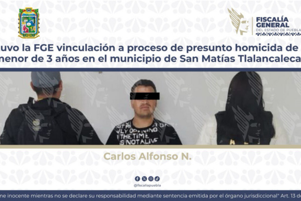 La Fiscalía General del Estado (FGE) informa que gracias a los elementos de prueba aportados, se logró que Carlos Alfonso N., fuera vinculado a proceso, por su probable responsabilidad en los delitos de homicidio calificado y tentativa de homicidio calificado hacia un menor de edad, estos hechos registrados en el municipio de San Matías Tlalancaleca.