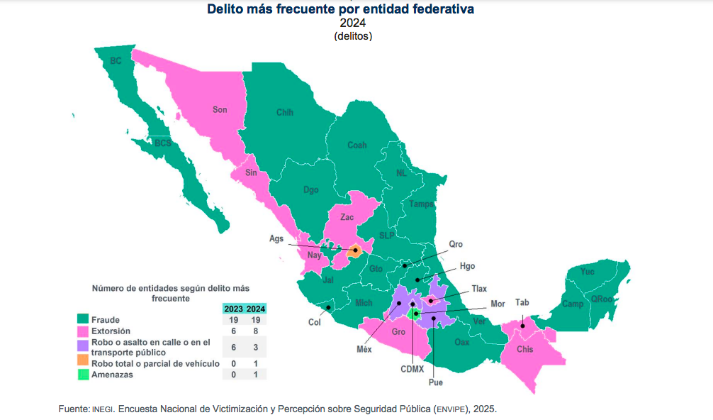La ENVIPE también detalla que los delitos que más se denuncian y afectan a los habitantes en Puebla es el robo o asalto en calle o en el transporte público, mientras que en Tlaxcala el que más afecta es la extorsión.