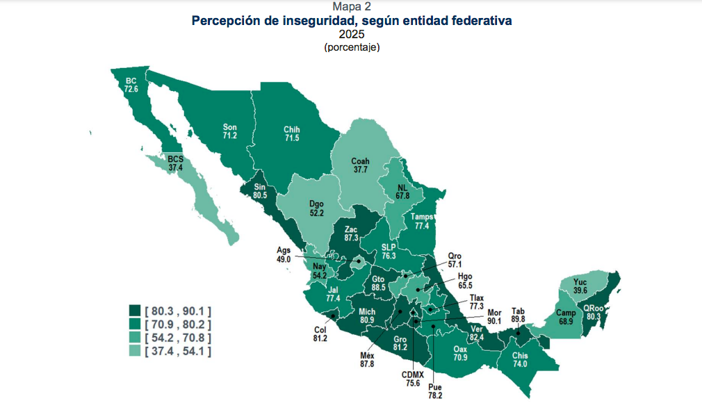 Las entidades con mayor porcentaje de Percepción de Inseguridad fueron: Morelos, con 90.1 %; Tabasco, con 89.8 % y Guanajuato, con 88.5 por ciento. Las que resultaron con los porcentajes más bajos fueron Baja California Sur, con 37.4 %; Coahuila de Zaragoza, con 37.7 %, y Yucatán, con 39.6 %.