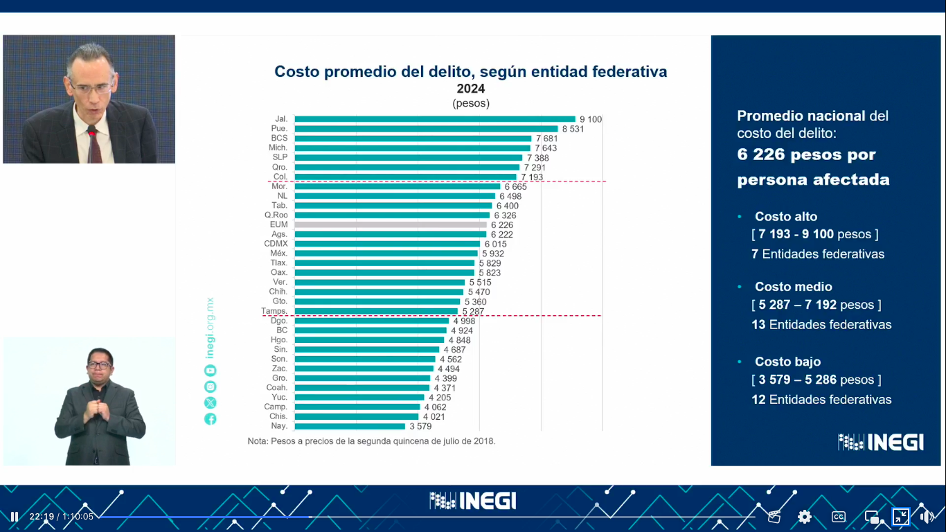La ENVIPE 2025 señala que el costo total del delito y la inseguridad en los hogares de todo el país se estimó en 269.6 mil millones de pesos, al cierre del 2024, lo que significó que cada persona afectada por un delito perdió 6,226 pesos. El INEGI precisó que esta cifra representa un 1.07 % del Producto Interno Bruto (PIB).