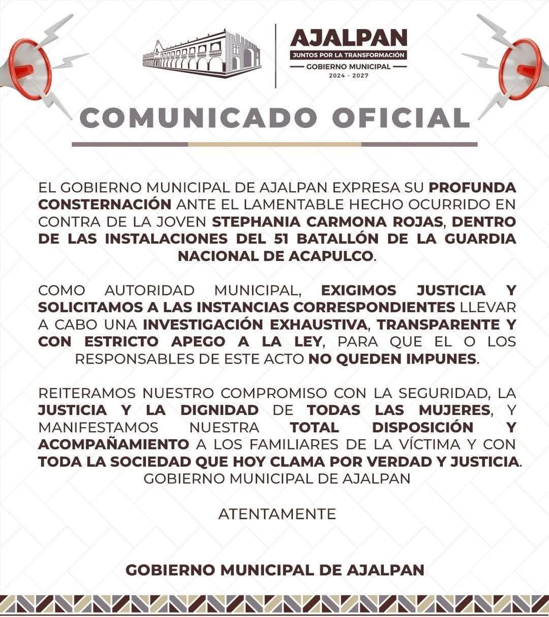 «Como Gobierno Municipal, exigimos justicia, solicitamos a las instancias correspondientes llevar a cabo una investigación exhaustiva, transparente y con estricto apego a la ley, para que él fue los responsables de este acto no queden impunes«, dice la publicación.