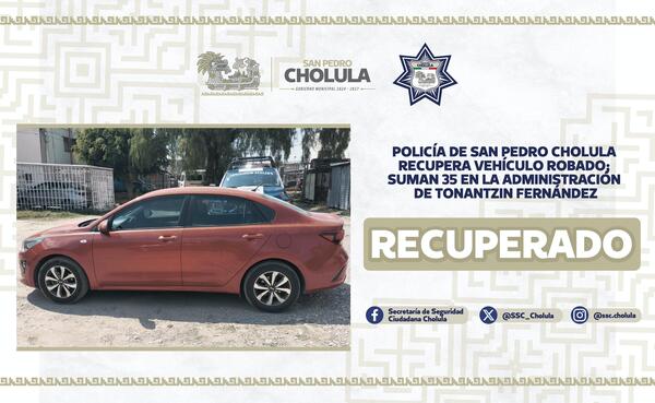 Como resultado de diversas estrategias implementadas para localizar vehículos con reporte de robo en San Pedro Cholula, la Secretaría de Seguridad Ciudadana (SSC Cholula), ha recuperado un total de 35 vehículos, en el periodo que comprende de octubre de 2024 a marzo de 2025, aunado a ello, 12 personas han sido detenidas por su probable participación en hechos con apariencia de delito relacionados a estos casos.