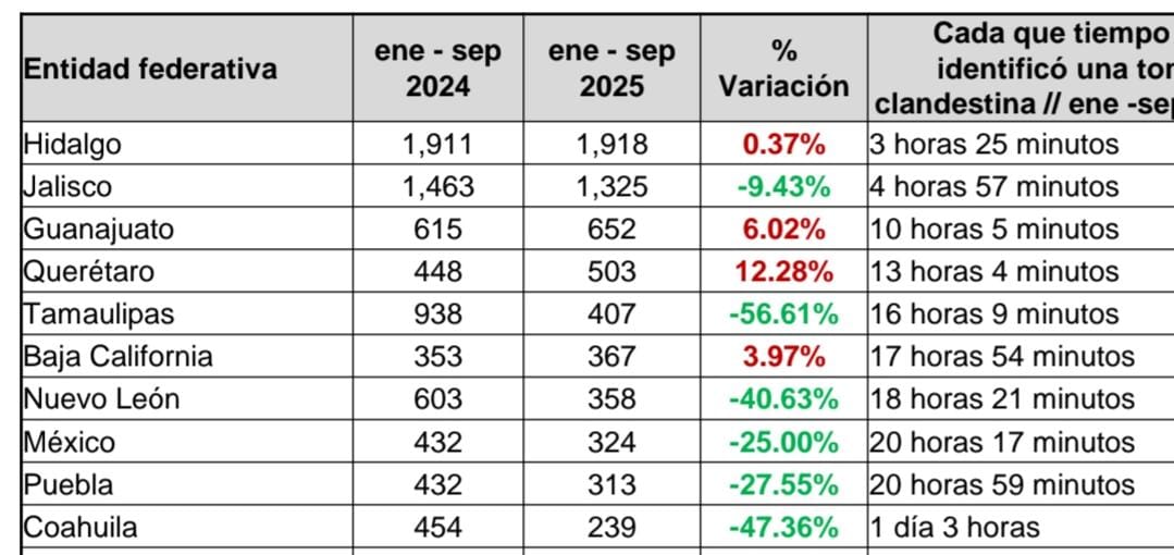 Al tercer trimestre del año, Puebla suma 313 tomas clandestinas por robo de gasolinas, una disminución del 27.5% en comparación con los reportes registrados en el mismo periodo de 2024, pero que la mantienen dentro de los 10 estados con mayor incidencia.