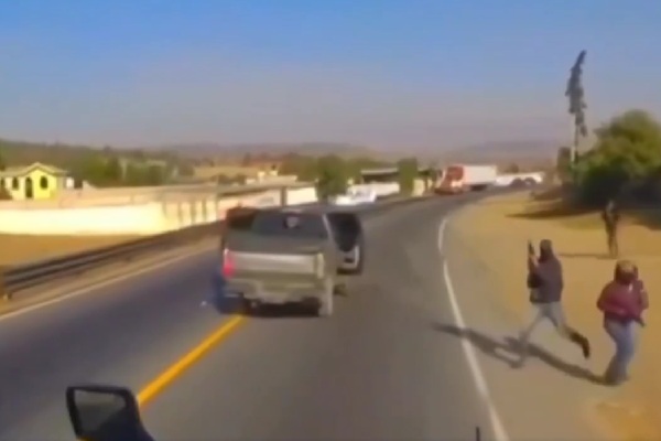 En las imágenes se observa cómo el conductor de un tractocamión intenta arrollar a un grupo de hombres armados que lo interceptaron con la aparente intención de despojarlo de su unidad y pertenencias. La rápida reacción del chofer obligó a los presuntos delincuentes a huir del lugar.